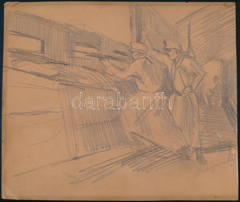 Leírás: Mednyánszky jelzéssel: Katonák a lövészárokban. Ceruza, papír, apró szakadással, 21×25 cm