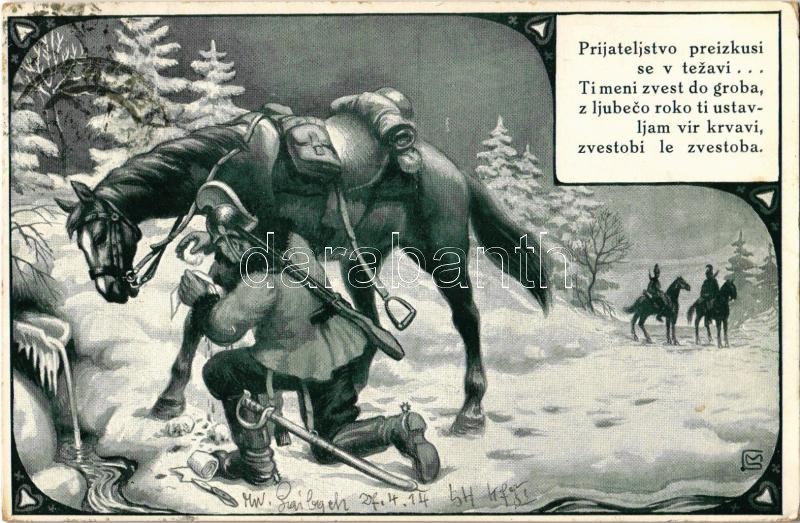Leírás: 1914 Prijateljstvo preizkusi se v tezavi... / WWI Austro-Hungarian K.u.K. military, Slovenian soldier with his horse in winter, artist signed (EK)
