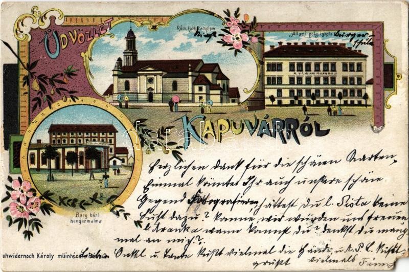 Leírás: 1899 Kapuvár, Berg báró hengermalma, Római katolikus templom, Állami polgári iskola. Schwidernoch Károly Art Nouveau, floral, litho (EM)