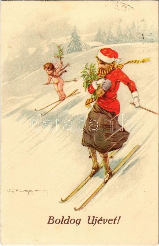 Boldog Újévet! / Winter Sport, New Year greeting card with skiing lady... https://www.darabanth.com/hu/345-Gyorsarveres/345.0/Kepeslapok/Sport~2000073/Boldog-Ujevet-Winter-Sport-New-Year-greeting-card-with-skiing-lady-and-angel-artist-signed-E~II1954330