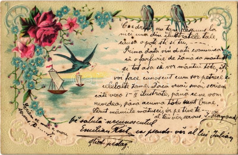 Leírás: 1901 Greeting card with swallows, sailboats. Art Nouveau, Emb. floral litho