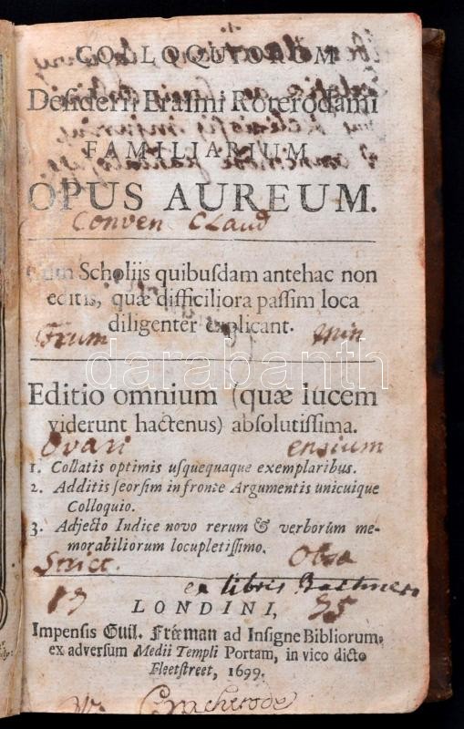 [Rotterdami Erasmus]: Colloquiorum Desiderii Erasmi Roterodami Familiarium Opus Aureum. Cum Scholiis quibusdam antehac non editis, quae difficiliora passim loca diligenter explicant, Editio omnium (quae lucem viderunt hactenus) absolutissima. Londini, 1699, Guil. Freeman, 1 t. (rézmetszetű címkép)+8+471+15 p. Latin nyelven. Korabeli aranyozott gerincű egészbőr-kötés, festett lapélekkel, kissé kopottas borítóval, sérült, kissé hiányos gerinccel, magánkönyvtári címkével, foltos címlappal és címképpel, a címlapon bejegyzésekkel, néhány foltos lappal. Rotterdami Erasmus (Desiderius Erasmus Rotherodamus (1466-1536) népszerű Colloquiájának 1699 Londoni kiadása./ [Erasmus von Rotterdam]: Colloquiorum Desiderii Erasmi Roterodami Familiarium Opus Aureum. Cum Scholiis quibusdam antehac non editis, quae difficiliora passim loca diligenter explicant, Editio omnium (quae lucem viderunt hactenus) absolutissima. Londini, 1699, Guil. Freeman, 1 t.(copper engraved title image)+8+471+15 p. In Latin Language. Full leather-binding, with colored pageedges, with worn cover, with damaged spine, with library label and stamp, with spotty title image and title page, with some spotty pages.