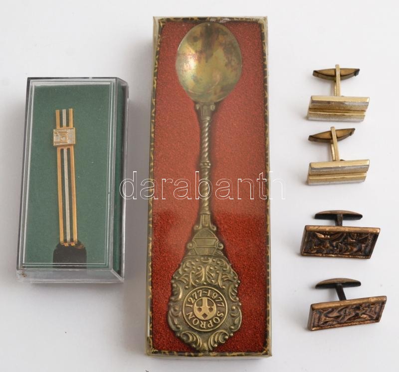Leírás: Kis bolha tétel: 2 pár mandzsettagomb, nyakkendőtű, emlékkanál