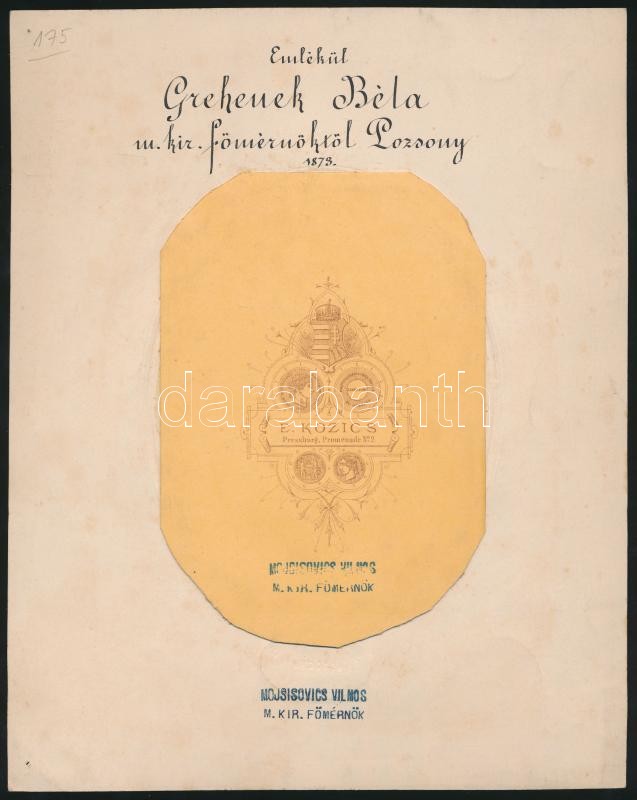 1873 Grehenek Béla m. kir. főmérnök, Pozsony, E. Kozics műterméből, fe... https://www.darabanth.com/hu/345-Gyorsarveres/345.0/Mutargy-papirregiseg-egyeb/Foto~500021/1873-Grehenek-Bela-m-kir-fomernok-Pozsony-E-Kozics-mutermebol-feliratozott-fenykep-1~II1089696