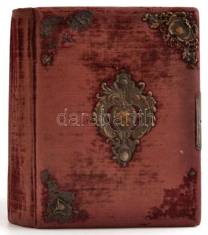 Leírás: cca 1880 Antik fotóalbum benne kb 50 vizitkártyával és kabinetfotóval. Rézveretes plüss borításban