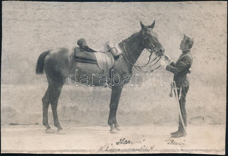 cca 1900 Várady Albert (1870-?) huszárhadnagy és lova, későbbi ezredes, m. kir. varasdi 10. honvéd huszárezred tisztje, későbbi ezredes, fotó kartonra kasírozva, körbevágott, feliratozva, 10x14 cm/ cca 1900 Albert Várady (1870-?) lieutenant and his horse, army officers of the Hungarian Royal 10th Husar Regiment of Varaždin, photo on board, with writings, cropped, 10x14 cm.