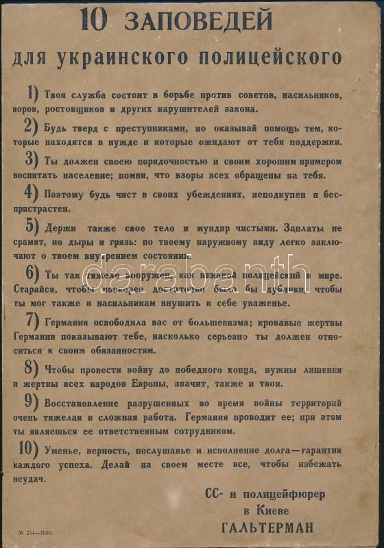 cca 1942 10 Gebote fuer den ukrainischen Schutzmann / 10 zapovedey dlya ukrainskogo politseyskogo, Hans Haltermann kijevi SS-Führer rendelete az ukrán rendőrök részére, német és orosz nyelven