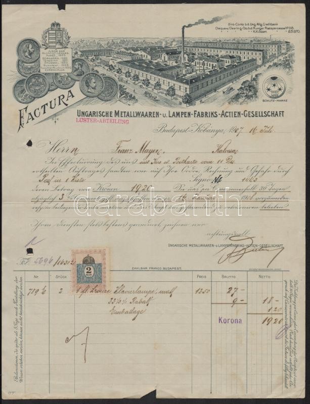 Leírás: 1907 Budapest-Kőbánya, Ungarische Metallwaaren- und Lampen-Fabriks-Actien-Gesellschaft fejléces számlája, rajta a gyár képével, okmánybélyeggel