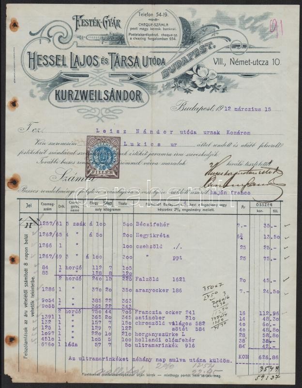 1912 Bp., Hessel Lajos és Társa Utóda Kurzweil Sándor Festékgyárának f... https://www.darabanth.com/hu/345-Gyorsarveres/345.0/Mutargy-papirregiseg-egyeb/Okmanyok~500018/1912-Bp-Hessel-Lajos-es-Tarsa-Utoda-Kurzweil-Sandor-Festekgyaranak-fejleces-szamlaja-okm~II1957236