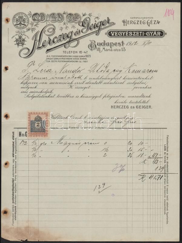 1912 Bp. VIII., Herczeg és Geiger Vegyészeti Gyárának fejléces számláj... https://www.darabanth.com/hu/345-Gyorsarveres/345.0/Mutargy-papirregiseg-egyeb/Okmanyok~500018/1912-Bp-VIII-Herczeg-es-Geiger-Vegyeszeti-Gyaranak-fejleces-szamlaja-okmanybelyeggel~II1957171