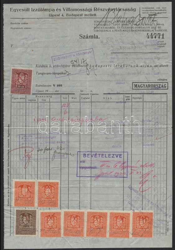 Leírás: 1930 Bp., Egyesült Izzólámpa és Villamossági Részvénytársaság fejléces számlája okmánybélyegekkel