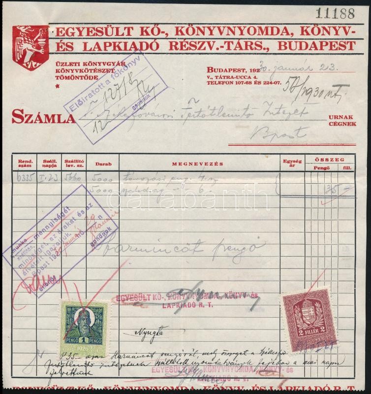 Leírás: 1930 Bp., Egyesült Kő-, Könyvnyomda stb. Budapest fejléces számla, illetékbélyeggel