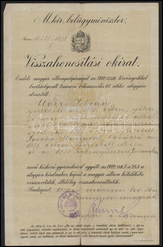 1931 Visszahonosítási okirat fővárosi utcaseprő részére https://www.darabanth.com/hu/345-Gyorsarveres/345.0/Mutargy-papirregiseg-egyeb/Okmanyok~500018/1931-Visszahonositasi-okirat-fovarosi-utcasepro-reszere~II1958489