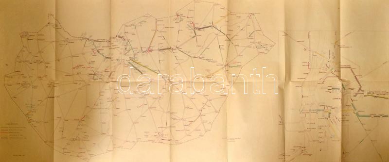 Leírás: 1945 Magyarországi és budapesti vasútvonalak nagyméretű, kézzel rajzolt térképe, rajta Budapest ma már meg nem lévő pályaudvaraival145x60 cm