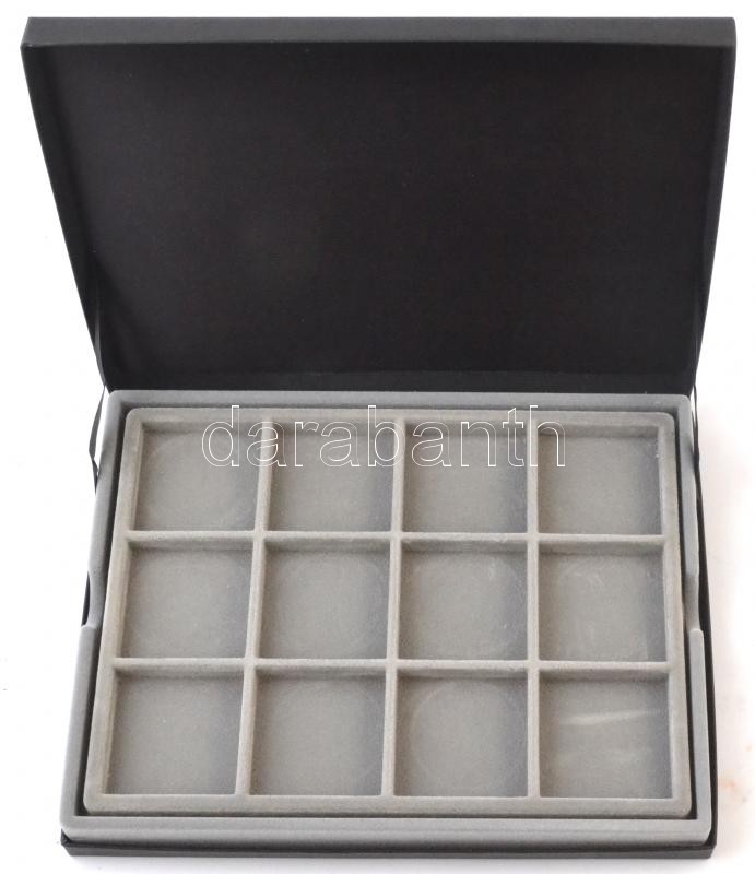 Leírás: Éremtartó doboz 2x12 férőhellyel. Minimalista fekete, szürke éremtartó tálcákkal, az egyik kivehető. Használt, jó állapotban.