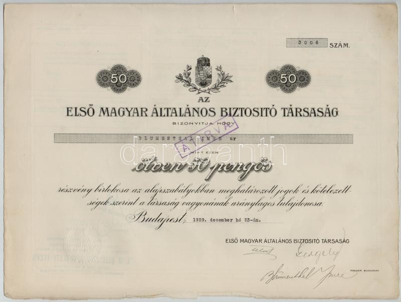 Budapest 1929. "Első Magyar Általános Biztosító Társaság" névre szóló részvénye 50P-ről, vízjeles papíron, szárazpecséttel, szelvényekkel, bélyegzésekkel T:II szakadás