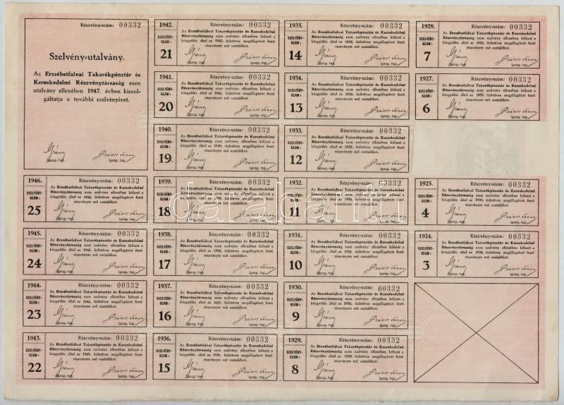 Erzsébetfalva 1922. "Erzsébetfalvai Takarékpénztár és Kereskedelmi Részvénytársaság" részvény összesen 200K-ról, szelvényekkel, bélyegzéssel és szárazpecséttel T:II