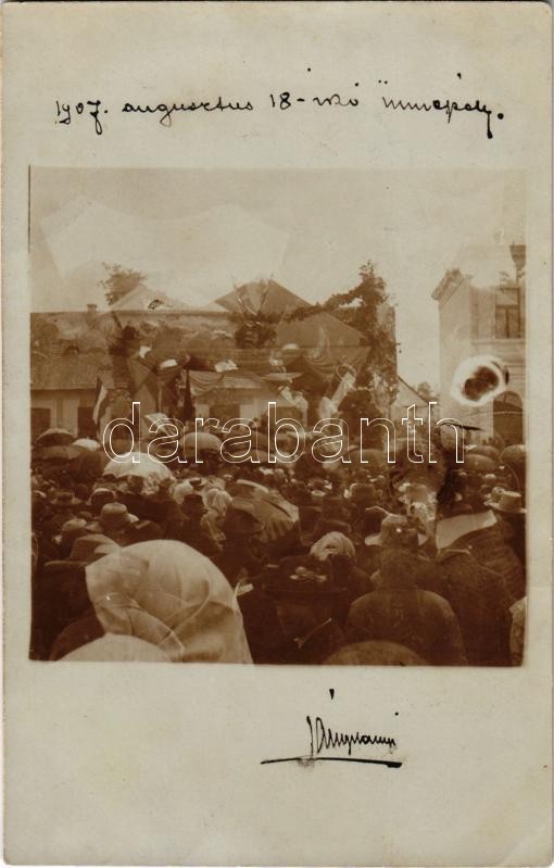 1907 Szinérváralja, Seini; augusztus 18-i ünnepély, II. Rákóczi Ferenc emlékére készített zászlóavatási ünnepség a Kossuth téri díszsátorban / flag inauguration ceremony for the memory of Francis II Rákóczi. photo (EK)