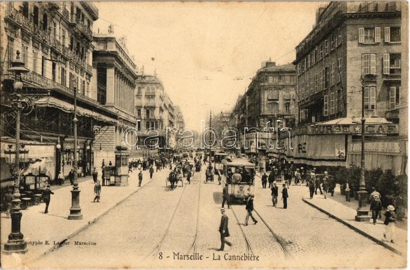 Marseille, La Cannebiere / street view with trams, cafe and shops https://www.darabanth.com/hu/346-Gyorsarveres/346.0/Kepeslapok/Franciaorszag~2000021/Marseille-La-Cannebiere-street-view-with-trams-cafe-and-shops~II1965133