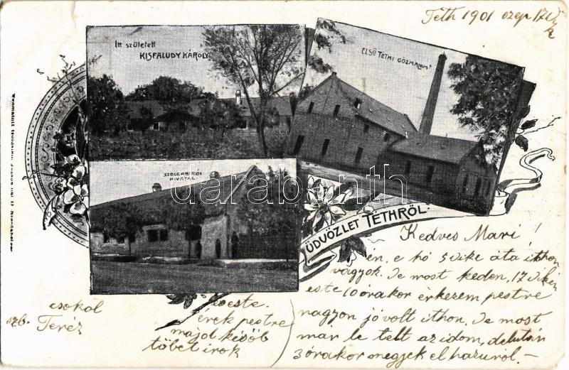 1901 Tét, Első téthi gőzmalom, Szolgabírói hivatal, Kisfaludy Károly s... https://www.darabanth.com/hu/346-Gyorsarveres/346.0/Kepeslapok/Magyarorszag~2000005/1901-Tet-Elso-tethi-gozmalom-Szolgabiroi-hivatal-Kisfaludy-Karoly-szulohaza-Art-Nouvea~II1962402