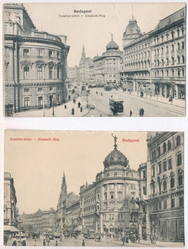Leírás: Budapest VII. Erzsébet körút (Blaha Lujza tér), villamos, üzletek - 2 db régi képeslap / 2 pre-1945 postcards