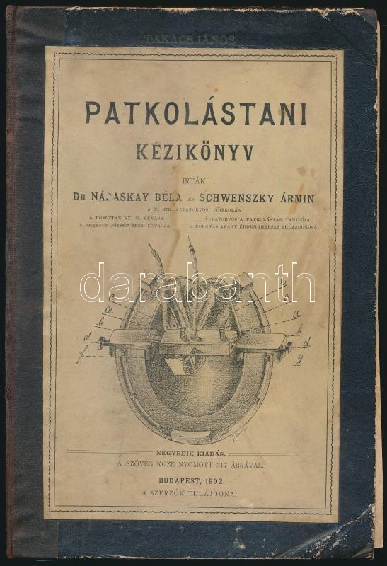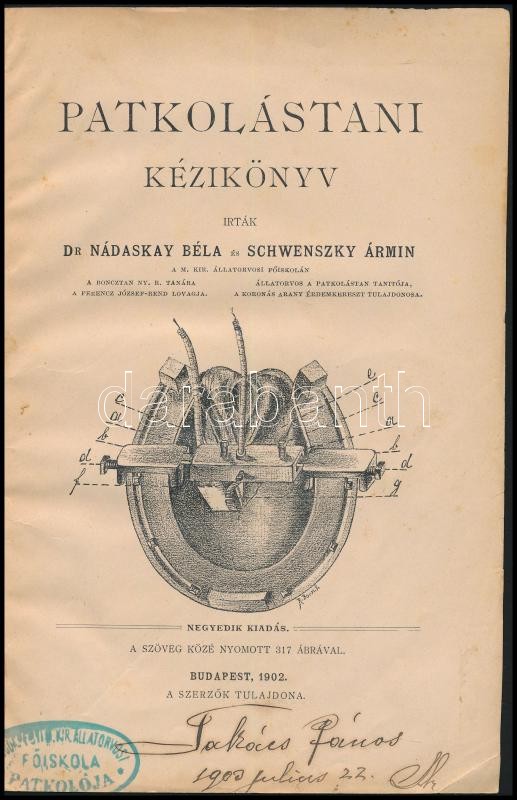 Dr. Nádaskay Béla-Schwenszky Ármin: Patkolástani kézikönyv. Bp.,1902, (Buischmann F.-ny.), XVI+256 p. Negyedik kiadás. Átkötött félvászon-kötés, kopott borítóval, a könyvtest egyben van, de elvált a borítótól, a címlap és az elülső szennylap elvált a könyvtesttől.