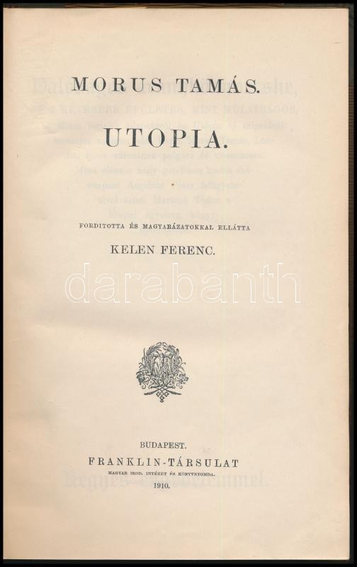 Morus Tamás: Utopia. Fordította és magyarázatokkal ellátta: Kelen Ferenc. Filozófiai Írók Tára. XXI. kötet. Első magyar nyelvű kiadás. Hozzákötve: Schopenhauer, Arthur: Az akarat szabadságáról. Fordította és magyarázatokkal ellátta: Kelen Ferenc. Filozófiai Írók Tára. XVII. kötet. Második kiadás. Bp., 1910-1913, Franklin, 184+126 p. Átkötött félvászon-kötés, kissé kopott borítóval.