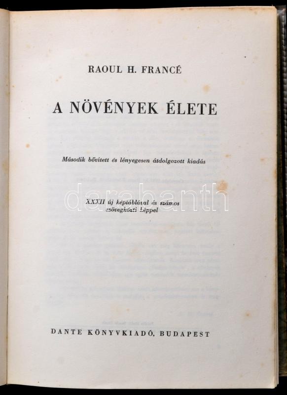 Raoul H. Francé: A növények élete. Fordította: Lambrecht Kálmán. Bp.,1945, Dante. Kiadói félvászon kötés, műanyag védőfóliában. kopott borítóval, kissé foltos lapokkal.
