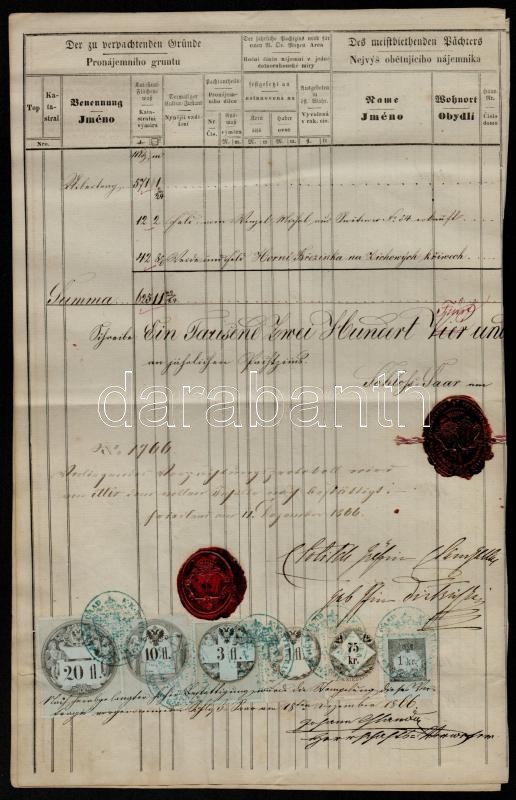 Leírás: 1866 Teljes okmány 20Fl + 10Fl + 3 Fl + 1Fl + 75kr +1kr illetékbélyeggel klf kiadásokkal