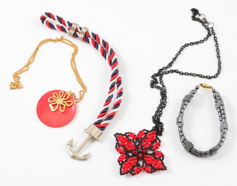 Leírás: Kis bizsu tétel, karkötők, nyakláncok, közte hematit, horgonyos karkötő, stb., 4 db