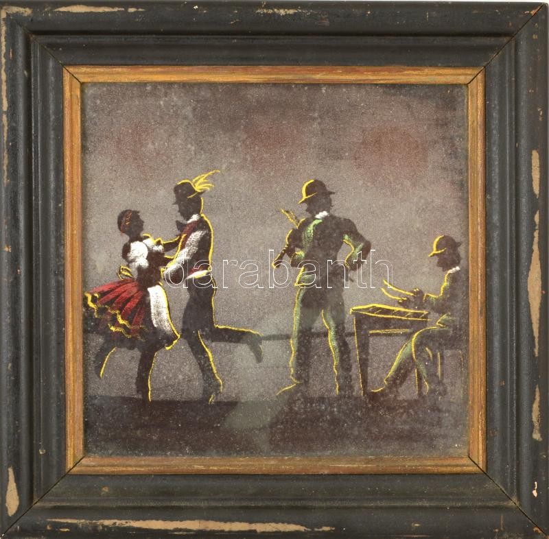 Leírás: Néptáncosok, textilkép, fa keretben, 21,5×21 cm