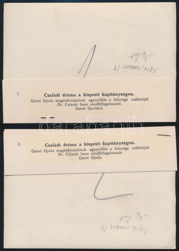 1913 Kispesti rendőrkapitányságon történt szerelemféltésből elkövetett gyilkosság elkövetője és áldozata. Gatsó Gyula és felesége. Korabeli sajtófotó hozzátűzött szöveggel / KIller and victim press photo 16x12 cm