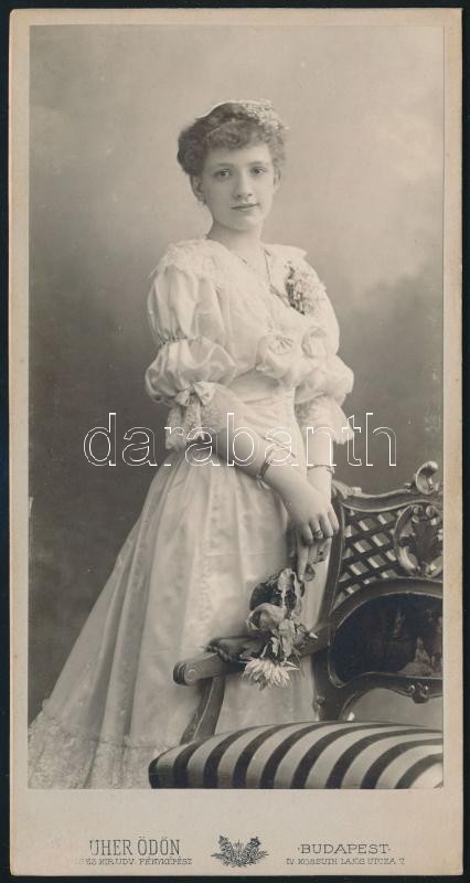 Leírás: cca 1900 Fiatal hölgy virágcsokorral, keményhátú fotó Uher Ödön budapesti műterméből, 16×8,5 cm