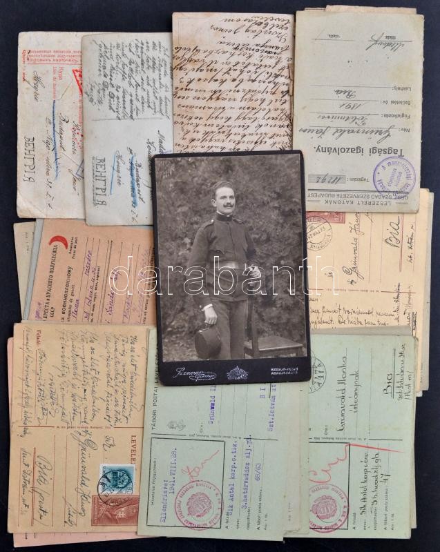 cca 1910-1944 Vegyes katonai tétel, közte a Leszerelt Katonák Orsz. Szabad Szervezetének igazolványával, 2 elküldött fotólappal, valamint egy keményhátú fotóval, Szamossy Ferenc kassai műterméből, rajta katonaportréval, egy 1916-os orosz hadifogoly levelezőlappal, rajta kisméretű fotóval, valamint 25 db II. világháborús tábori levelezőlappal, valamint egy orosz hadifogoly levelezőlappal.