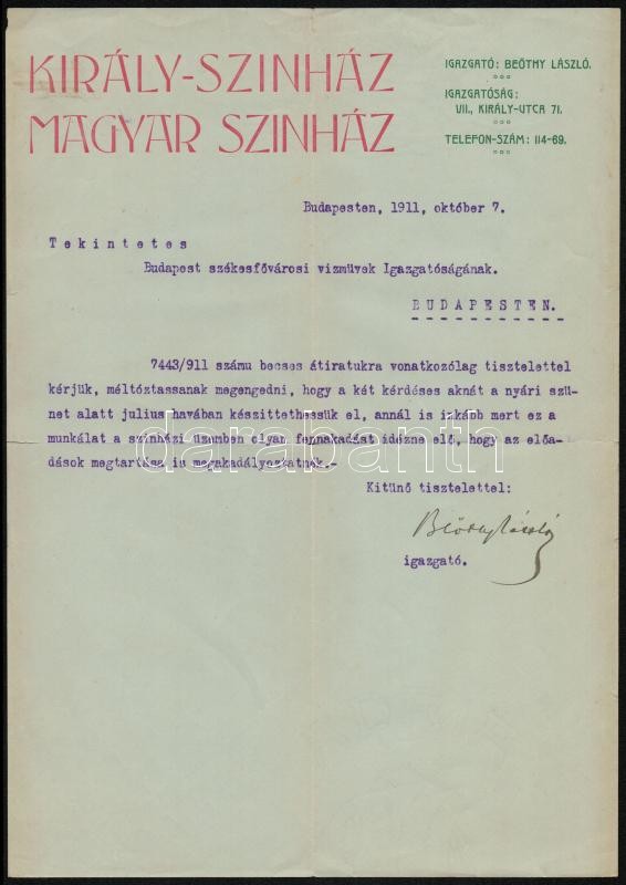1911 Beöthy László színigazgató gépelt, aláírt levele a fővárosi vízmű... https://www.darabanth.com/hu/346-Gyorsarveres/346.0/Mutargy-papirregiseg-egyeb/Okmanyok~500017/1911-Beothy-Laszlo-szinigazgato-gepelt-alairt-levele-a-fovarosi-vizmuvek-igazgatosaga~II1966158