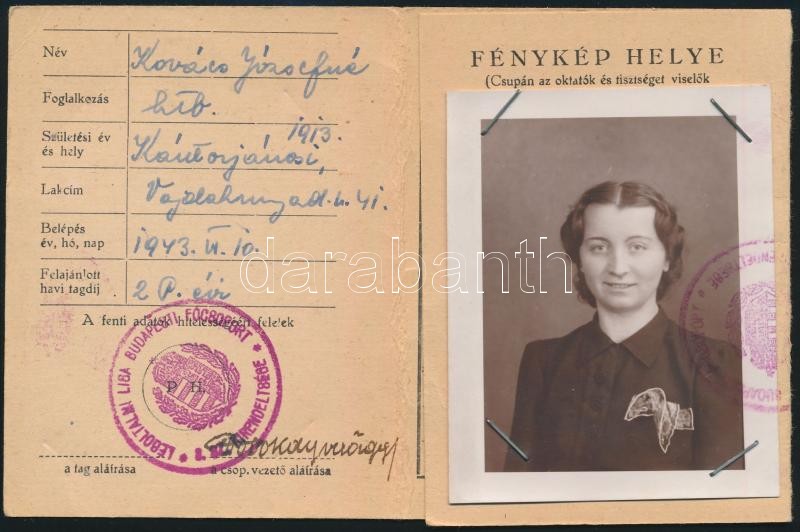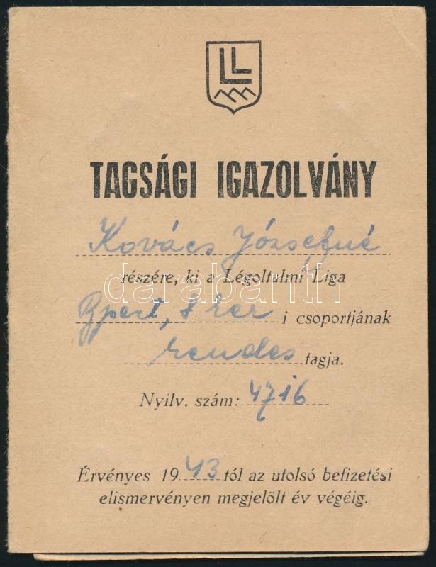 1943 Légoltalmi Liga fényképes igazolvány https://www.darabanth.com/hu/346-Gyorsarveres/346.0/Mutargy-papirregiseg-egyeb/Okmanyok~500017/1943-Legoltalmi-Liga-fenykepes-igazolvany~II1963455