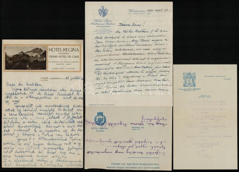 Leírás: cca 1911-1936 Hotelek fejléces levélpapírjaira írt levelek és menükártya, 7 db