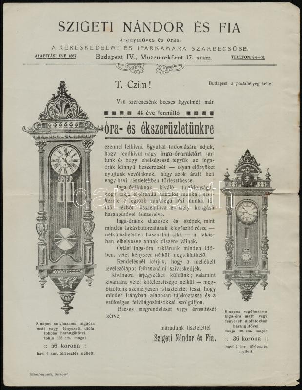 Leírás: cca 1910-1920 Szigeti Nándor és Fia aranyműves órás, a kereskedelmi és iparkamara szakbecsüsének reklámlapja