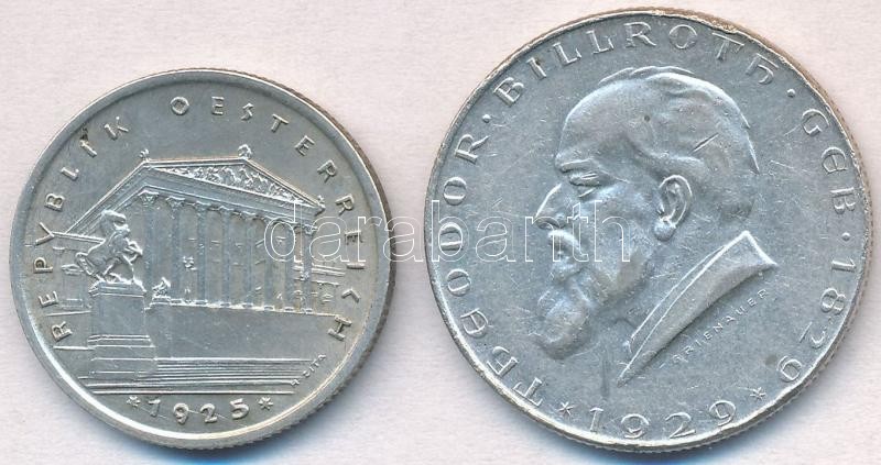 Ausztria 1925. 1Sch Ag + 1929. 2Sch Ag "Dr. Theodor Billroth születésének 100. évfordulója" T:2 ph.