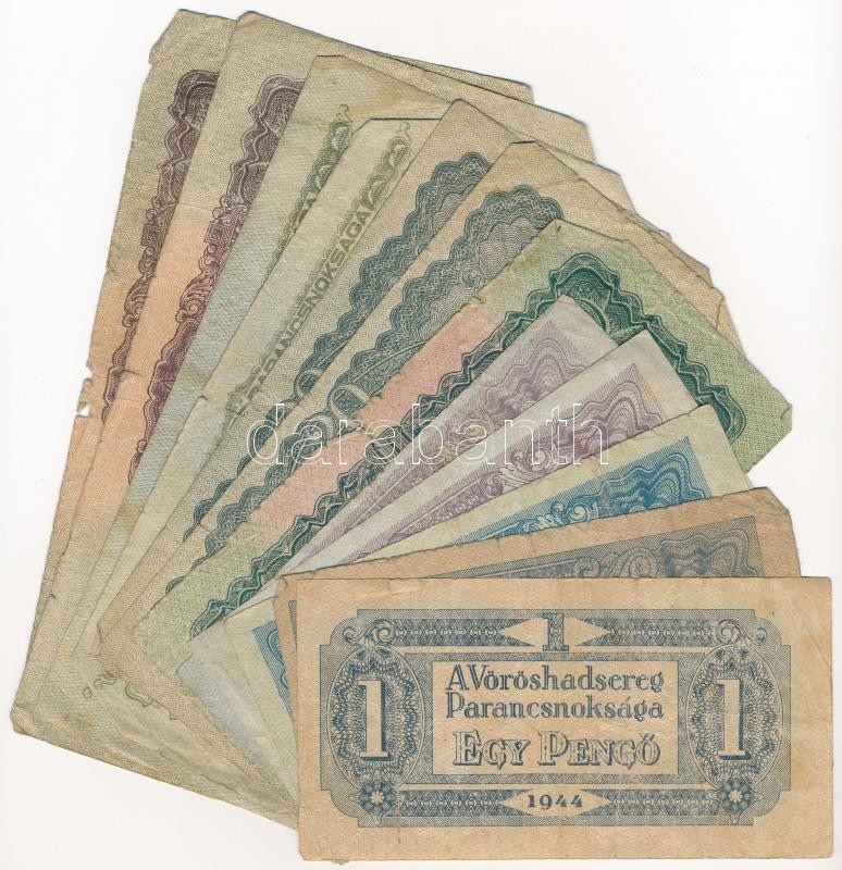 1944. 1P-100P (12x) "A Vöröshadsereg Parancsnoksága" T:III,III- https://www.darabanth.com/hu/346-Gyorsarveres/346.0/Numizmatika/Magyar-bankjegyek~1000007/1944-1P-100P-12x-A-Voroshadsereg-Parancsnoksaga-TIII-III-~II1962256