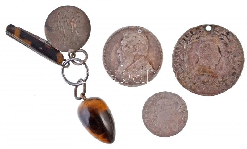 Leírás: 4db-os vegyes sérült, rossz tartású ezüstpénz, egyik kulcstartón, közte Dél-Afrika 1897. 1Sh Ag T:3,3-