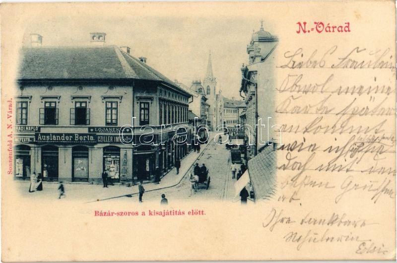 1899 Nagyvárad, Oradea; Bazár szoros a kisajátítás előtt, Aradi Napló kiadóhivatala, Lojanek J. fényképész, Czillér Imre és Társa, Ausländer Berta és kelmefestő üzlet. Sonnenfeld A. kiadása / shops, newspaper's office