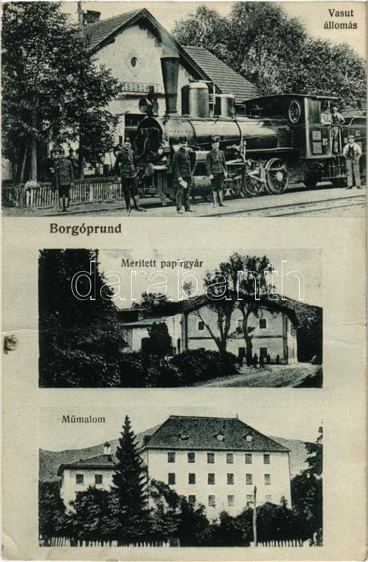 Leírás: 1917 Borgóprund, Prundu Bargaului; Vasútállomás, gőzmozdony, vasutasok, Merített papírgyár, Műmalom, hengermalom / Bahnhof / railway station, railwaymen, paper mill, rolling mill (fa)