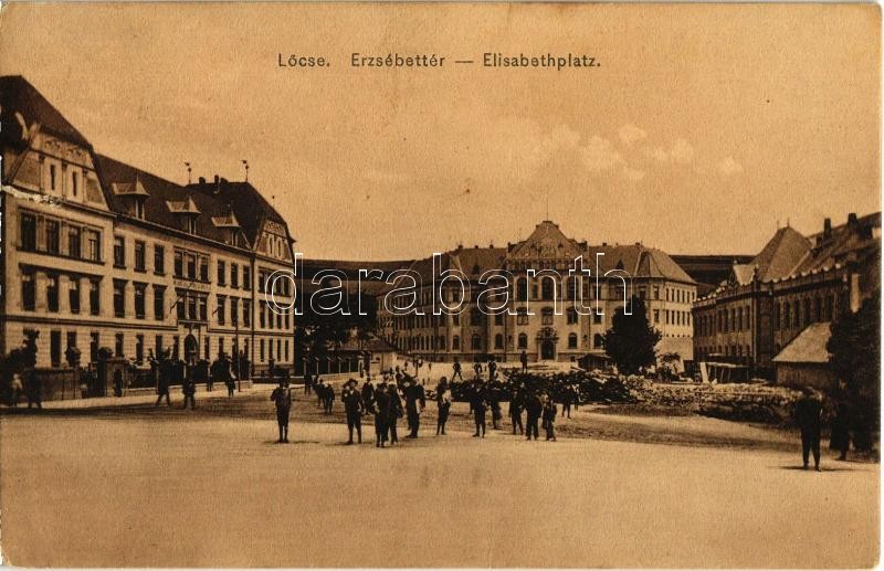 Leírás: 1910 Lőcse, Levoca; Erzsébet tér, M. kir. Főreáliskola, építkezés. Kiadja Braun Fülöp / square, school, construction site (kis szakadás / small tear)