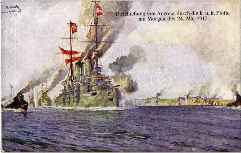 Beschiessung von Ancona durch die k.u.k. Flotte am Morgen des 24. Mai 1915. K.u.K. Kriegsmarine, Kriegshilfsbüro Nr. 187. / Osztrák-Magyar Haditengerészeti flotta Ancona bombázásánál, SMS Mária Terézia páncélos cirkáló, 65 F (ex Hydra) torpedónaszád / WWI Bombardment of Ancona with Austro-Hungarian Navy battleship SMS Kaiserin und Königin Maria Theresia (SMS Mária Terézia) and 65 F torpedo boat s: A. Sirk