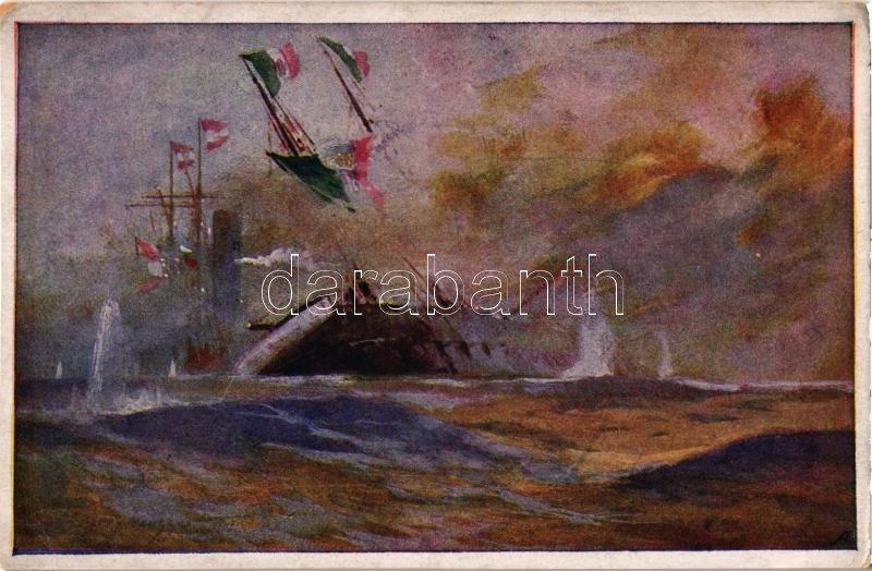 Die Seeschlacht bei Lissa. Rammung de "Re d'Italia". K.u.K. Kriegsmarine. Kriegshilfsbüro Nr. F. 107. / Az SMS Erzherzog Ferdinand Max elsüllyeszti az olasz "Re d'Italia" páncélost a lissai csatában / Battle of Lissa (1866), Austro-Hungarian Navy flagship Erzherzog Ferdinand Max sinks "Re d'Italia" s: Harry Heusser (EK)