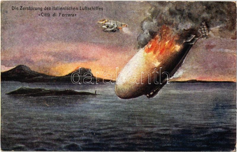 Die Zerstörung des italienischen Luftschiffes "Citta di Ferrara" Kriegshilfsbüro Nr. 157. / WWI The destruction of the Italian balloon "Citta di Ferrara" by a K.u.K. Kriegsmarine seaplane (hydroplan), artist signed