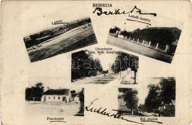 Leírás: 1928 Berhida, Lakath kastély, utca, Római katolikus templom, piac, Református paplak (gyűrődések / creases)