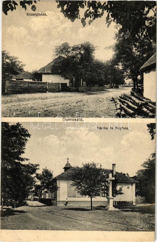 Leírás: 1931 Domoszló, Községháza, iskola és népház