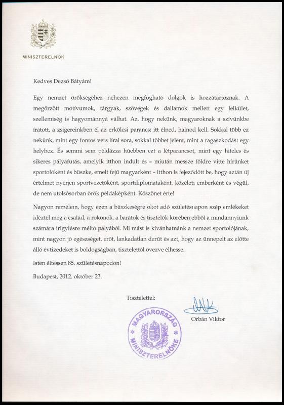 Leírás: 2012 Gyarmati Dezső olimpiai bajnok vízilabdázó 85. születésnapjára írt köszöntő levél Orbán Viktor miniszterelnök aláírásával aranyozott mappában